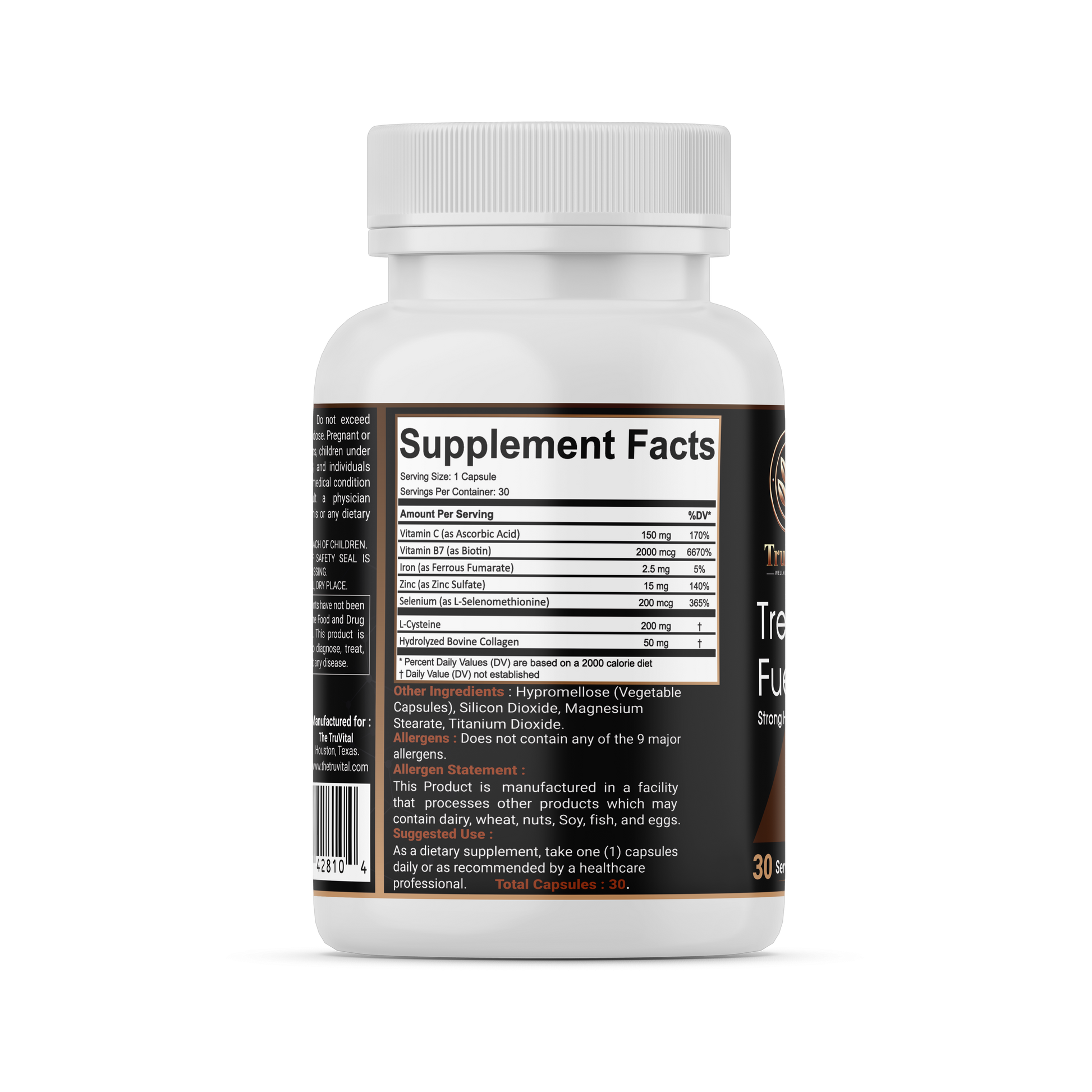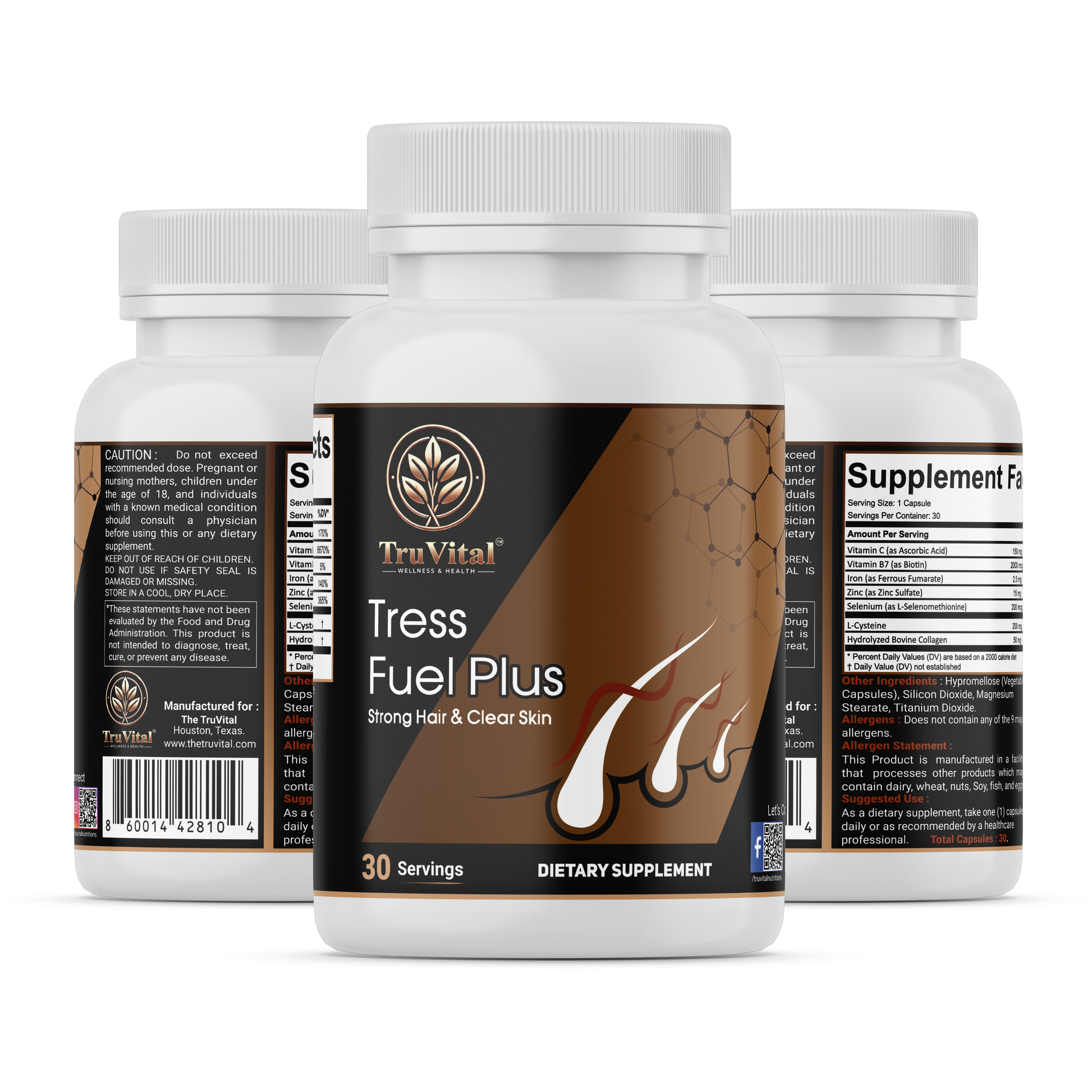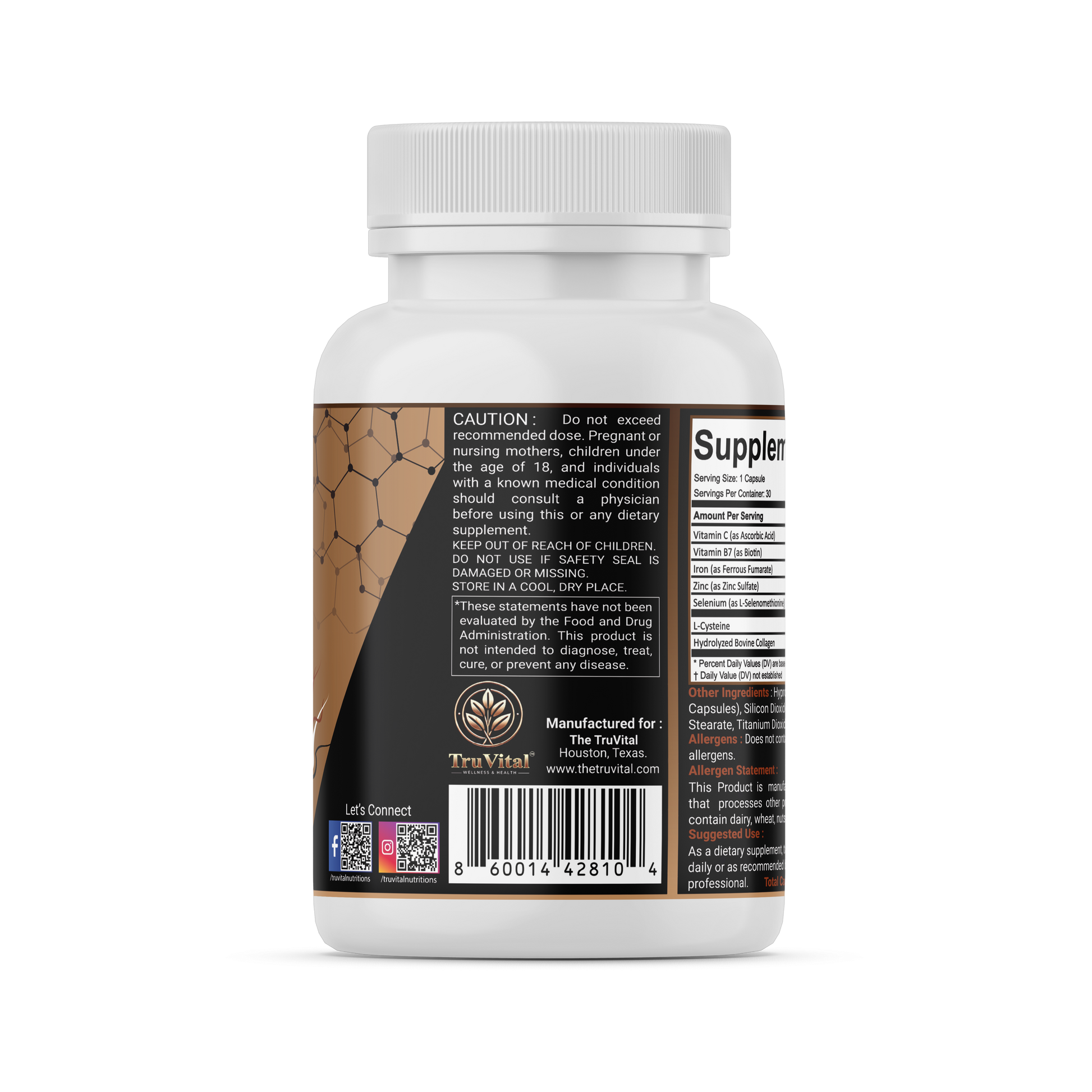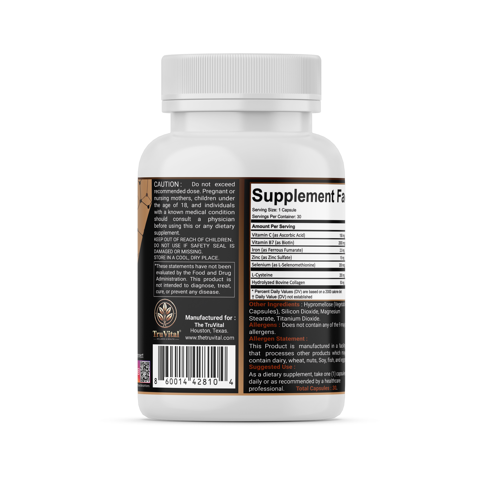 TRUVITAL Hair Support is formulated to promote healthy hair growth and strengthen strands from within. This supplement provides essential nutrients that nourish hair follicles, helping to reduce breakage and support overall scalp health. Ideal for those seeking to maintain vibrant, resilient hair. This advanced formula blends essential vitamins, minerals, amino acids, and collagen peptides that work together to help maintain healthy hair growth, scalp vitality, and skin hydration.