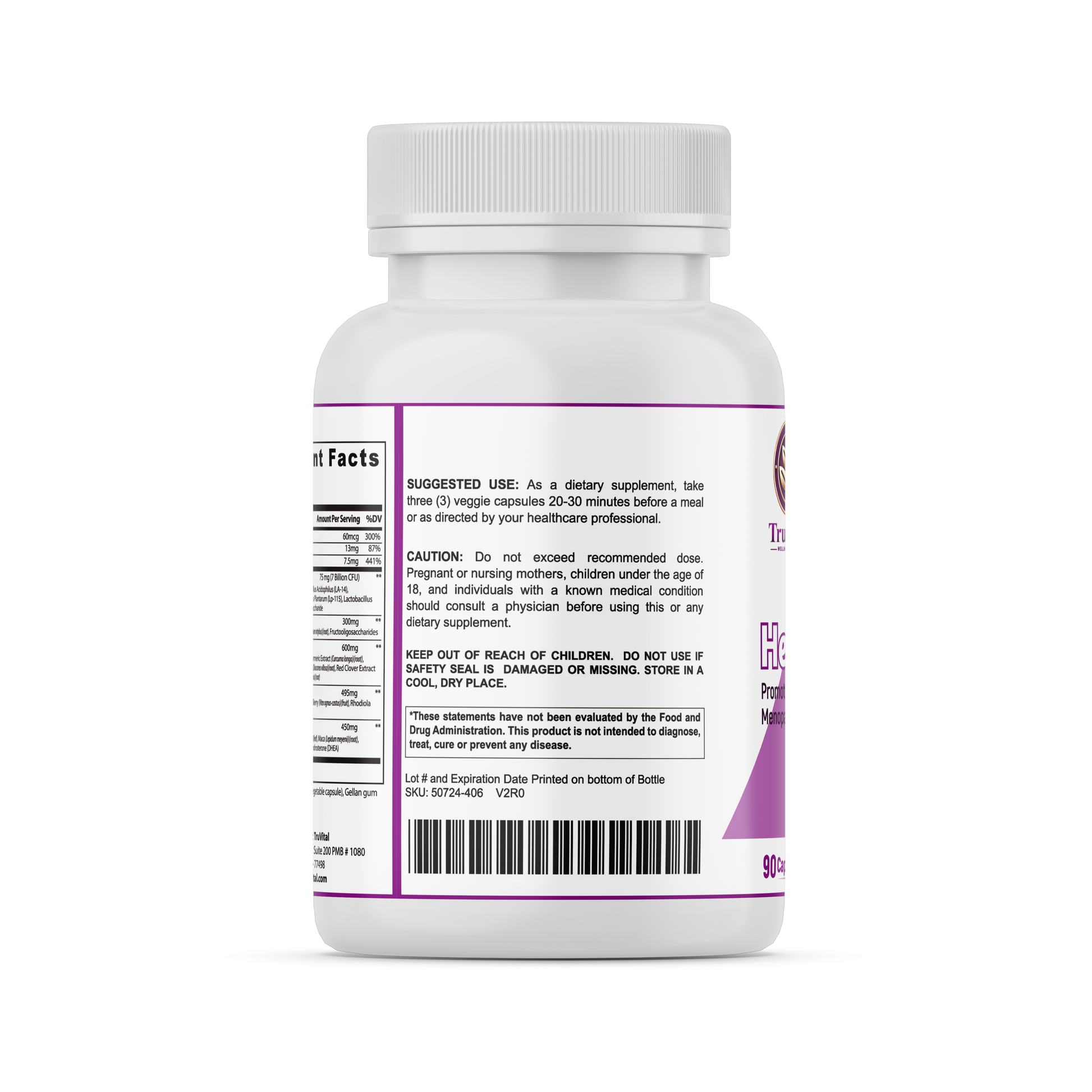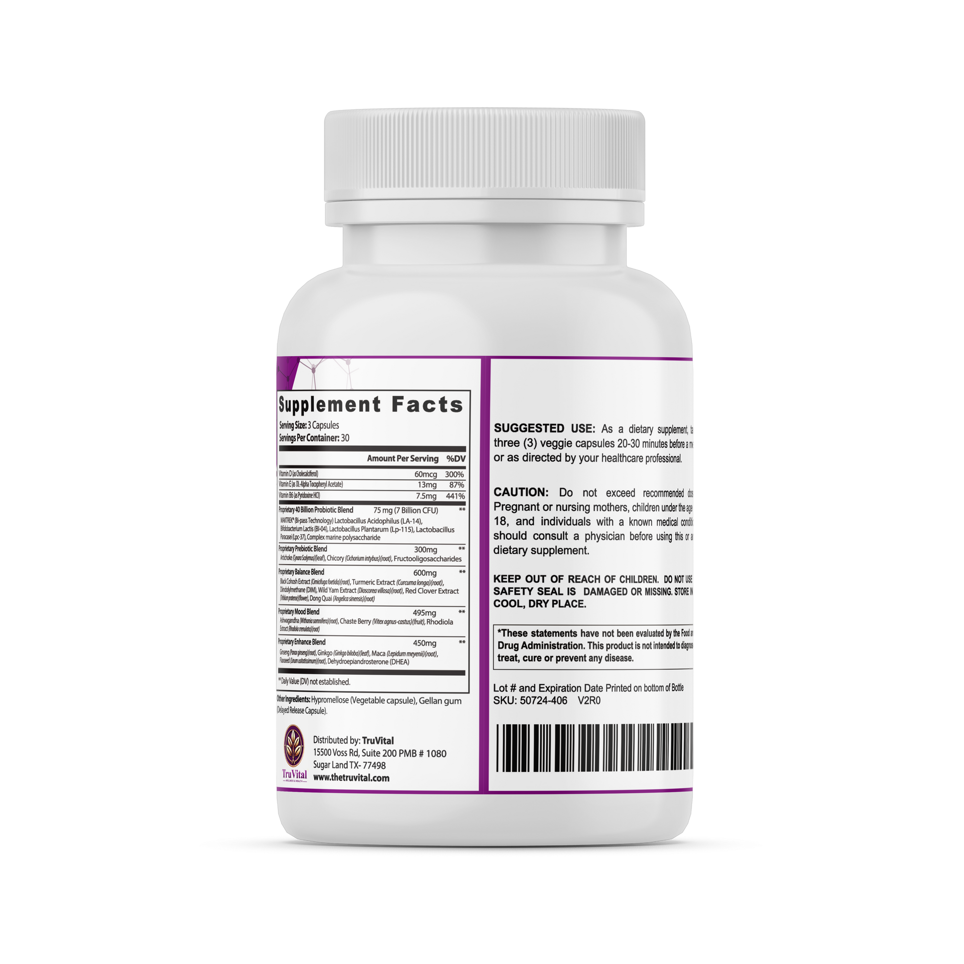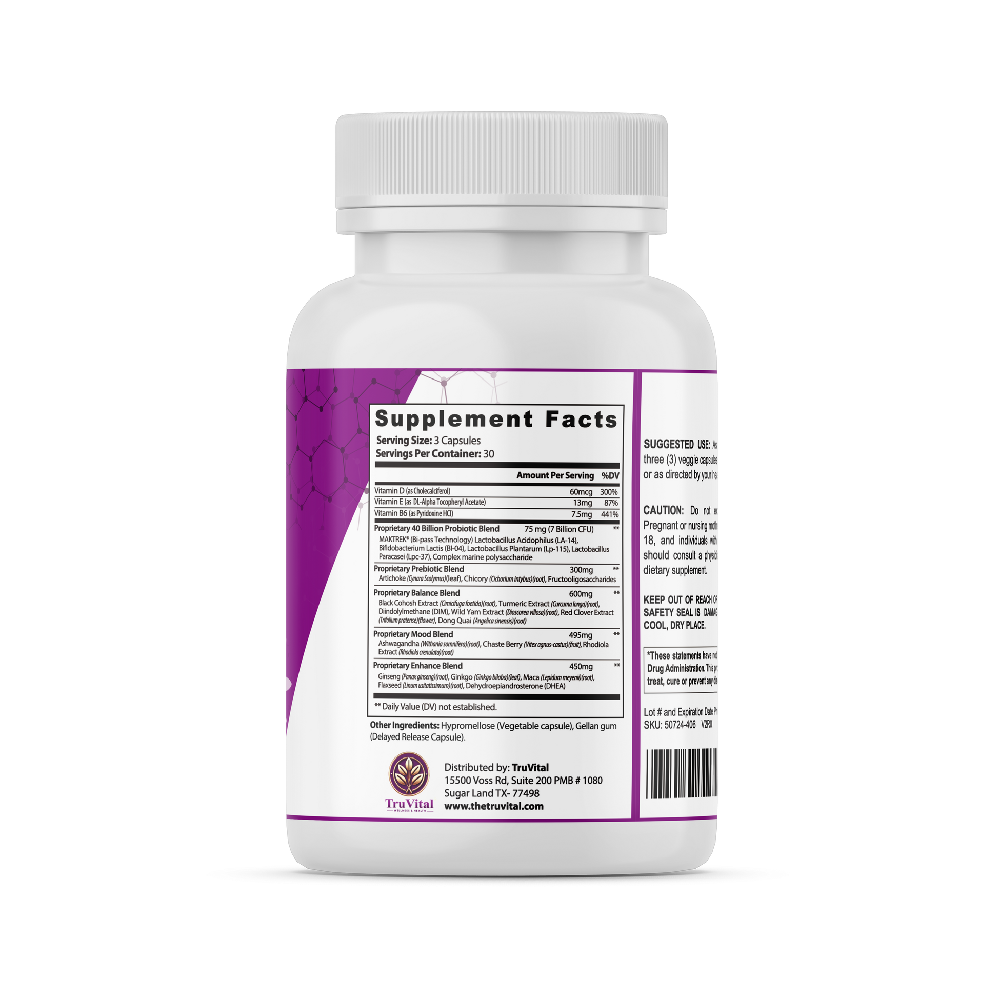TruVital HerEase is an advanced multi-action formula crafted to support women during all stages of menopause — from perimenopause to postmenopause. This unique blend combines essential vitamins, probiotics, and adaptogenic botanicals that help promote hormonal balance, mood stability, and daily comfort.